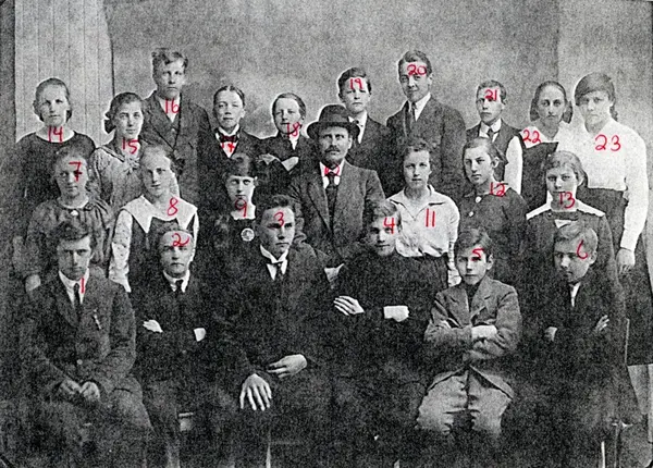 Foran fra venstre: 1ukjent, 2ukjent, 3 Jon Morud, 4ukjent, 5 Jo Brenneng, 6 Ole Olsen, 7ukjent, 8 Pauline Sundmark g.Vold, 9 Alfilda Kjellvang, 10 lærer Gjermund G. Nordgård, 11ukjent, 12ukjent, 13ukjent, 14ukjent, 15ukjent, 16ukjent, 17 Geir Pernup, 18 Olaf Strinæs, 19 Lyder Pettersen, 20 Trygve Holt, 21 Paul Myhr, 22 Aslaug Buflod g.Holt, 23 Valborg Engerdal Vestby.