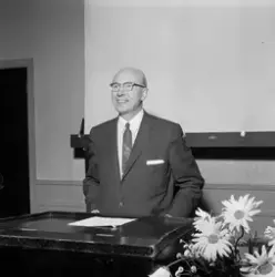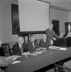 Bilde 1: Fra venstre: Morton J. Schwartz, Oliver M. Kaufmann, Carl F. Oechsle og formannen i Trondhjems Handelsstands Forening, direktør Eivind Hørgård på talerstolen.