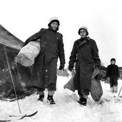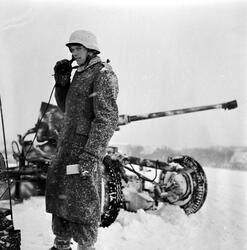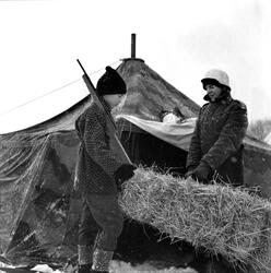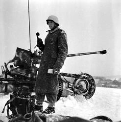 "Vi har begynt på den siste av de 16 månedene, og det er det som holder oss oppe, mener menig Kristiansen, Meråker, Sigvartsen, Molde og Myklebust, Ålesund der de lamper inn pakksekker i teltet ...sambandsmann Holøien fra Os i Østerdalen som hadde radiovakt ved kanonen .... derimot syntes ungene i strøket at det var gildt med litt militærbesøk, og 9-åringen Knut Morten Bye hadde allerede etablert seg som privat skiltvakt ..."