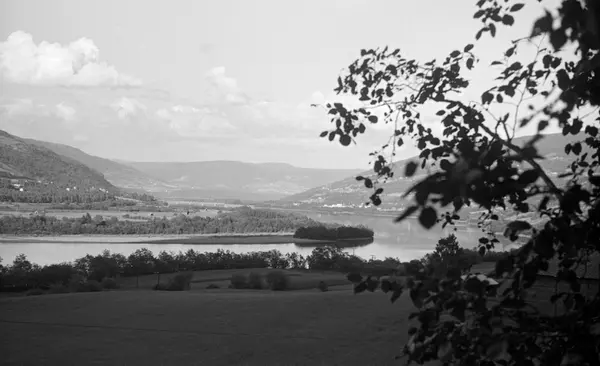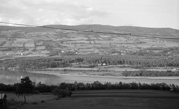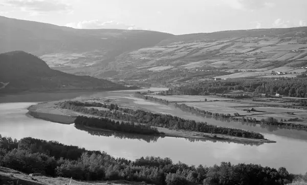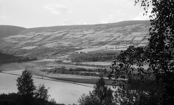 Landskapsfotografi fra Sør-Fron i Gudbrandsdalen. Bildet ser ut til å være tatt fra vestsida av Lågen – fra Baksida – der engarealet framfor fotografen lå i skyggen av Ulbergshaugen. På motsatt side av det stilleflytende elveløpet ser vi over mot Odenvollen og Hovevollan, ei flat elveslette der gardbrukerne på ovenforliggende eiendommer dyrket vinterhøy som ble lagret i løer i påvente av sledeføret. Nederst i lia til venstre i bildet, langs jernbanetraséen, vokste det skog. I venstre halvdel av bildet skimter vi Hundorpbrua. Bak den ser vi mot Kjønnås i Ringebu kommune. Grenda som lligger delvis skjult bak en del greiner til høyre på bildet kalles Nørdre Lia. Dette fotografiet ble tatt i 1959.