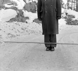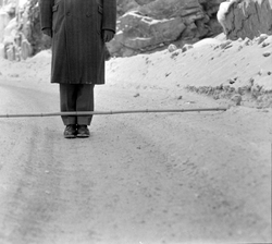 Innskr. på neg.konvolutt:"Dårlig veidekke (uhøvlet) i Roald Amundsens vei (Adr.)". Jan. -1956
