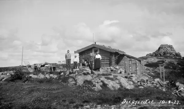 Deifjellet skogbrannvakstasjon i Åmot, Hedmark, fotografert 10. 8. 1922. Deifjellet ligger i nærheten av Deset-grenda, og brannvaktstasjonen her ble etablert av Åmot brannvesen i 1898. I første omgang ble det bare bygd ei enkel laftehytte på bakken. Anlegget ble modernisert med økonomisk støtte fra forsikringsselskapet Skogbrand i 1932.