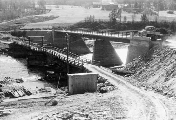 Den gamle og den nye Ulekleivsbrua på Dovre i Oppland, fotografert i slutten av april 1960. Gammelbrua var ei bjelkebru av tre, bygd på steinfylte tømmerkar i begynnelsen av 1930-å...