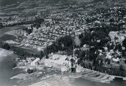 Mesna Kartonfabrik, bilde tatt mot øst. Til venste, bebyggelsen på Busmoen. Den gamle avfallsplassen lå der til ca 1950 da den ble flytte til Hovemoen. Lenger nord er Skjellerudjordet. Ved bjørkelunden til venstre ligger nå Nordre Gravlund. Like ovenfor er Andreassen gartneri , og lenger nord skimtes Smestadmoen. Lysgaard ligger øverst til høyre.