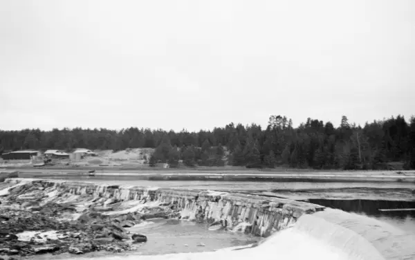 Subject Fra dammen som stuvet opp vann til kraftverket ved Skjefstadfossen i Glomma, i Heradsbygda i Elverum. Fotografiet ble tatt høsten 1939, og det er montert som den høyre delen av et panoramabilde i et av Glomma fellesfløtingsforenings album (jfr. SJF.1989-03535). Her ser vi overløpsdammen, som var 312 meter lang, og litt lavere i den østre enden (til høyre på dette bildet) enn i den vestre. Denne løsningen ble valgt for å skape et drag i vannet som trakk fløtingsvirket mot den østre delen av elveløpet, der det var noe djupere enn i den midtre og vestre delen, og følgelig noe mindre fare for at stokkene skulle sette seg fast og pakkes sammen i hauger som det ble krevende og farlig for fløterne å løsne.