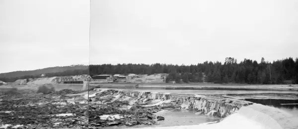 Fra dammen som stuvet opp vann til kraftverket ved Skjefstadfossen i Glomma, i Heradsbygda i Elverum. Fotografiet ble tatt høsten 1939, og det er montert som den høyre delen av et ...