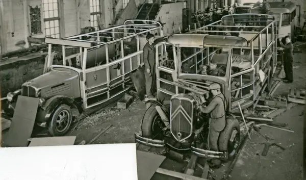 Bussen til høyre er en av to identiske Citroën 1935, karosseri under bygging for A/S Rutebileiernes Turbiler av Skabo Jernbanevognfabrikk, Oslo. De ble registrert på A-6841 og A-6842. Opplysninger fra Bussbasen til Rutebilhistorisk Forening, kfr. Asbjørn Rolseth: Håndverk på hjul (Oslo 2001), s. 386-389. Bussen til venstre er en Federal.