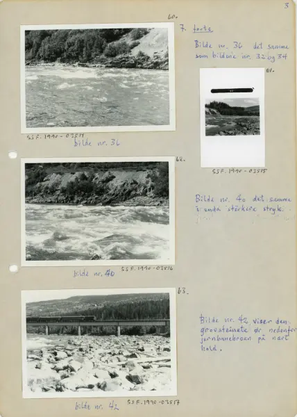 - Dette fotografiet er fra samlinga etter Glomma fellesfløtingsforening og forløperne, Christiania Tømmerdirektion (Øvre Glommens fællesfløtningsforening) og Fredrikstad Tømmerdirektion (Nedre Glommens fællesfløtningsforening). Da det ble klart at det gikk mot avvikling av fløtinga i Glommavassdraget i midten av 1980-åra initierte Norsk Skogbruksmuseum noe som ble kalt «Prosjekt Glomma». Historikeren Øivind Vestheim og fotografen OT Ljøstad fulgte fløtinga i vassdraget med kamera de siste to fløtingssesongene, mens museumsdirektør Tore Fossum samarbeidet med administrasjonen og styret i Glomma fellesfløtingsforening om best mulig ivaretakelse av levningene etter den viktige aktiviteten fløtinga hadde vært. En del installasjoner i vassdrag måtte imidlertid fjernes, slik vassdragslovgivningen forutsatte. Mange husvære ble overdratt til grunneiere for en rimelig pris, og noe ble overlatt til aktører som ville drive formidling av vassdrags- og fløtingshistorie. Arkivene etter virksomheten ble overdratt til Riksarkivet, som valgte å la det bli liggende i en av kontorbygningene ved Fetsund lenser. Ordning av dette materialet ble påbegynt under ledelse av Øivind Vestheim. Etter at det ble etablert et museum ved Fetsund lenser i 1990 har personale derfra hatt det daglige forvaltningsansvaret for arkivet etter Glomma fellesfløtingsforening. Fotomaterialet etter organisasjonen ble i forbindelse med avviklinga av fløtinga overlatt til Norsk Skogbruksmuseum. Det besto av 72 album, samt en del «løse» kopier og negativer. OT Ljøstad reproduserte en del av motivene ved hjelp av mellomformatkamera med negativ svart-hvitt-film. Materialet ble også enkelt registrert, i første omgang med stikkord (ofte stedsnavn og opptaksdatoer) som var skrevet inn i albumene. Skanning og fyldigere registrering tas innimellom andre oppgaver, og ettersom samlinga er stor, vil det ta lang tid før dette arbeidet er fullført.