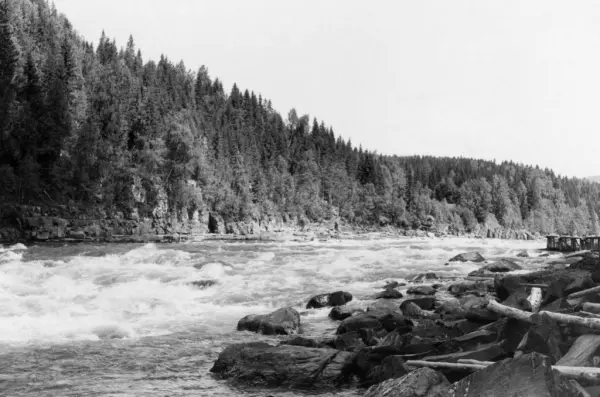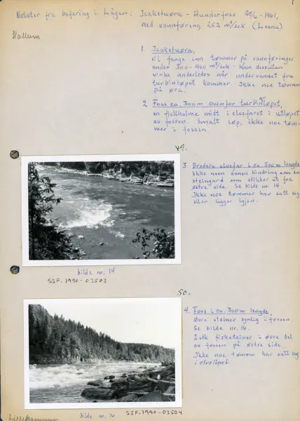 «4. Foss i ca. 300 m. lengde, store steiner synlig i fossen. Se bilde nr. 16 [Dette er bilde nr. 16 i dette albumet]. 2 stk. fisketeiner i øvre del av fossen på østre side. Ikke noe tømmer har satt seg i elveløpet.»