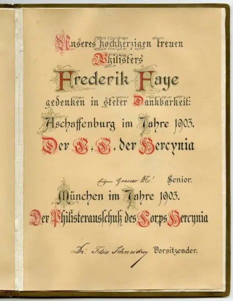 Fredrik Faye var en del av det tyske studentbrorskapet Hercynia (corps Hercynia München) som ble etablert 15.11.1847. Diplomet har symbolet (zirkel) til brorskapet på en av sidene (ser ut som "Av!") samt har en utmerkelse skrevet på tysk og signert av dr. Felix Schneider