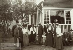 Eiendommen tilhørte statsråd C. Middelthon. En glimrende lakseelv i nærheten. .Fra venstre: Karl G. Kielland, Dagfin H. Berner (hvit caps), Erik Berentsen (sort hatt), fru Rachel Bergesen (delvis skjult), fru Olga Middelthon, Olga Berentsen, Cornelius Middelthon, Lina Gabrielsen, fru Robertsen Larsen (?), fru Martha Monsen, fru Anna Kielland, Jonas Schanche Monsen (sittende på benk) og Andreas Robertsen Larsen..Bildet er medtatt i hytteboken fra Helle..(Etter opplysninger gitt av Trygve Middelthon)
