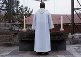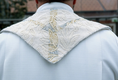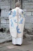 Ett av tre verk. Verket er håndvevet i naturhvit bomull med ullbroderier. Broderiene er laget i moulinegarn i ulike blåtoner, sølv og gull. Messehakelens hovedfarge er hvit med bro...