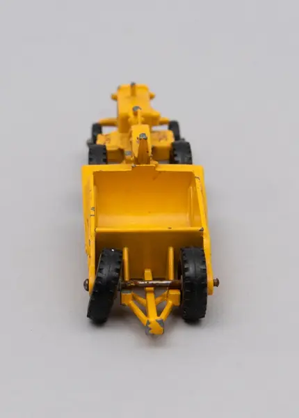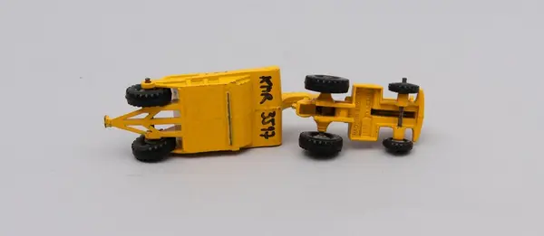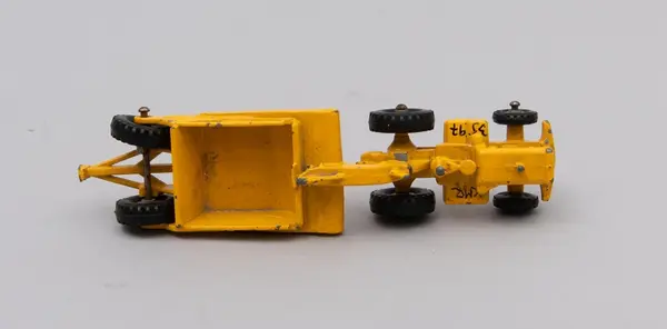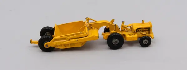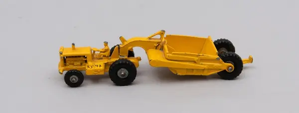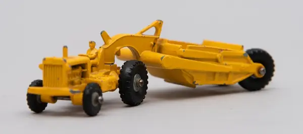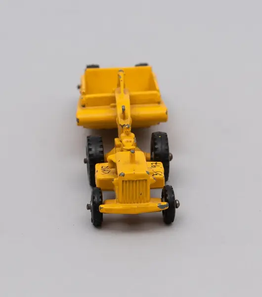 Traktor med henger. Begge i metall. De er gule og på traktoren sitter en mann/bonde.