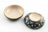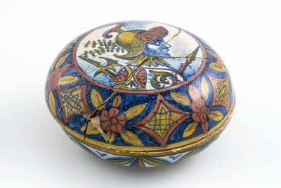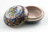 Liten keramikkskål med lokk, smaler mye av mot bunn og topp. Påmalt dekor med romersk (?) soldat i profil med hjelm, spyd og øks. Lokket har vært knust i flere biter, og er limt sa...