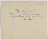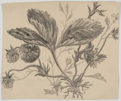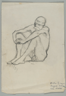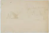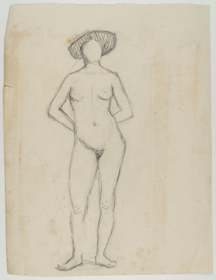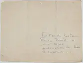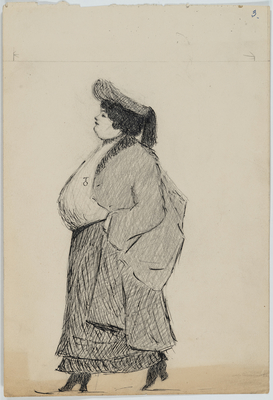 Penne- og blyanttegning av korpulent kvinne i helfigur profil. Kvinnen har på seg hatt, skjørt, skjorte med lommeur og lang jakke/ kåpe. På baksiden noe som ser ut som skriftprøver...
