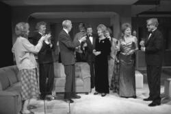 Scene fra Nationaltheaterets oppsetning av Alan Ayckbourns "Monki Bisniss". Elleve kvinner og menn kledd for fest står i en gruppe, der de prater og drikker. I forgrunnen sitter en ung mann og leser en bok. Forestillingen hadde premiere 8. september 1989. Toralv Maurstad hadde regi og medvirkende var blant annet Tor Stokke som Jack, Kari Simonsen som Poppy og Leif Juster som Ken Ayres.