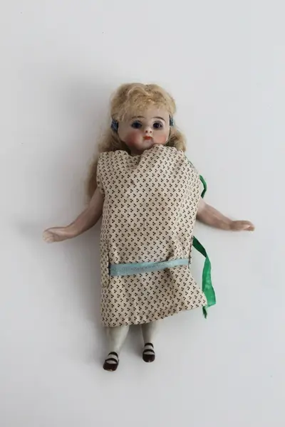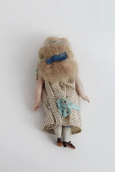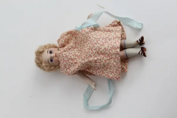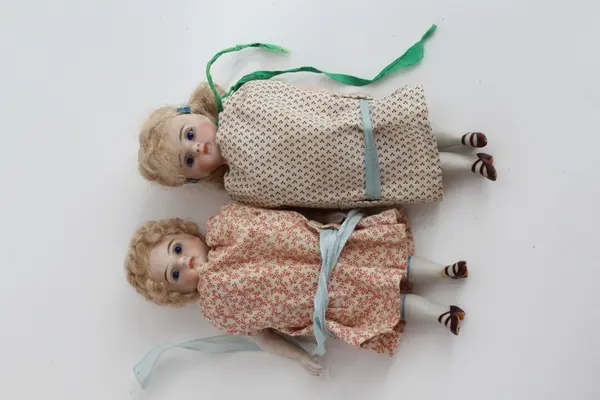 To stykk små porselensdukker. Ene med kort krøllete hår, rød blomstrerte kjole med blått silkebånd og påmalt ansikt og sko. Den andre med langt lyst hår i brunprikkete kjole med blått silkebånd og påmalt ansikt og sko.