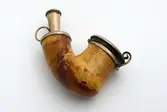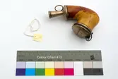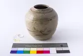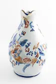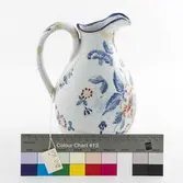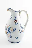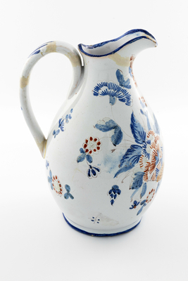 Keramikkmugge med smal tut og hank. Grå bunnfarge og påmalt dekor av blomster og overflødighetshorn i blått, rødt og oransje. Nederste del av hanken og en del av tuten har vært ska...