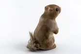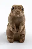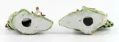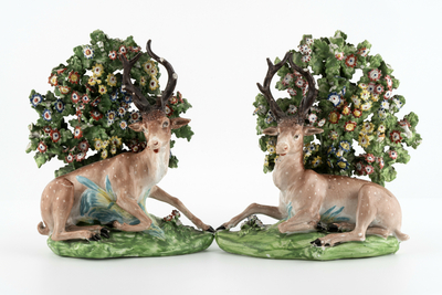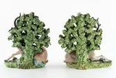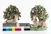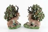 To pyntegjenstander i keramikk, hver i form av en hjort liggende foran et grønt, mangefarget blomstrende tre. Henholdsvis merket PEM.277 A og B. Gjenstand A har liggende hjort ven...