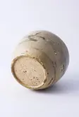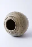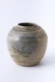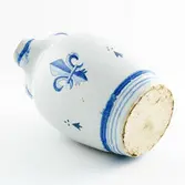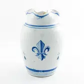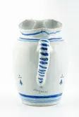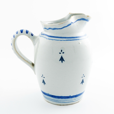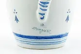 Keramikkmugge med grå glasur. Stor Fleur de lis under tuten og pil-aktige symboler påmalt i blått. Håndmalt keramikk fra Quimper i Bretagne, også omtalt som Quimperware. Har tilhør...