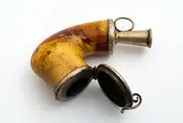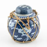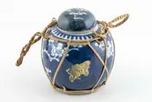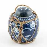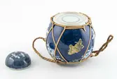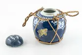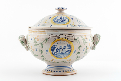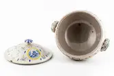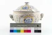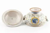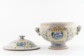 Rund terrin på stett. I keramikk, med lokk og to hanker. Beige glasur i bunn, påmalt dekor av blomster, ranker og sløyfer. Motiv av borg på ene siden, motiv av vindmølle på den and...