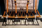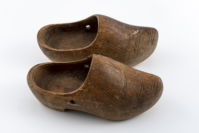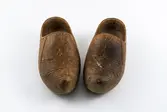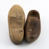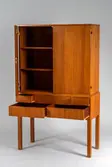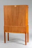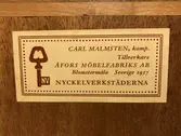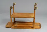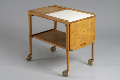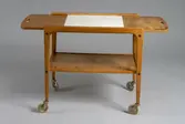 Trillebord med to klaffer. Topplaten kan skyves sidelengs slik at en eller begge klaffer er slått opp. Posisjonen låses med et metallbeslag under. Hull til håndtak i begge kortende...