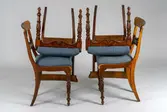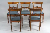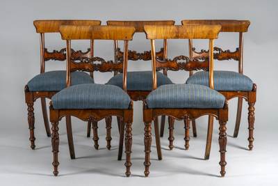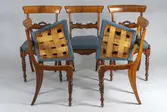 5 like spisestuestoler i utskåret, beiset bøk, med felter av finert mahogni eller valnøtt. Noen skader i treverk. Løse, trukne seter i stripete, blått trekk med 4 kraftige fjærer i...