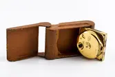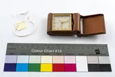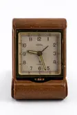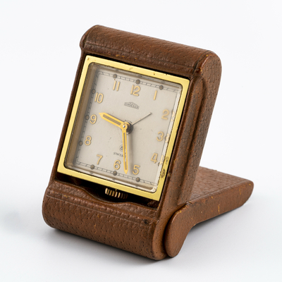 Reiseklokke fra merket Angelus fra Sveits. Ur med i messingfarge festet i brunt skinnetui. Med lokk som i åpen posisjon fungerer som støtte slik at det kan stå på bordet. Uret kan ...