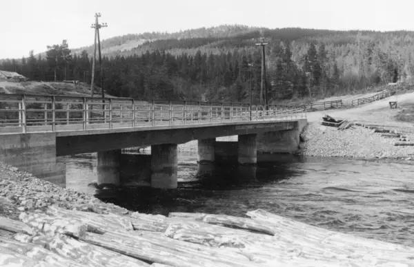 Slangen bru i Skåbu i Nord-Fron. Dette fotografiet ble tatt i mai 1961, på et tidspunkt da denne brua må ha vært ny. Det dreier seg om ei bjelkebru av betong med stålrekkverk på be...