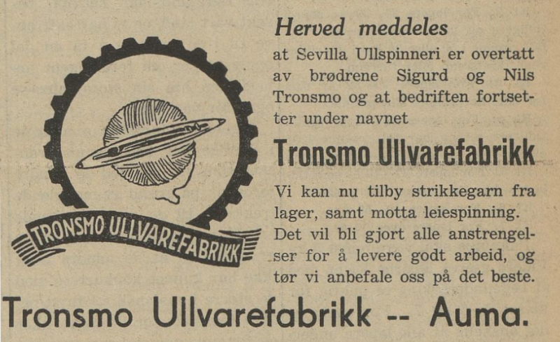 "Ullvarefabrikken på Auma". Østlendingen, 18. mars 1940.