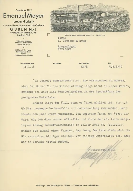 Men i april 1938 kommer en beskjed fra Pavlova Leather Company i Abingdon-on-Thames om at de ikke kan levere 100 fot "White Persian Grain Leather" som bestilt. Og i januar 1938 kommer en avvisning fra tredje generasjons eiere (også to brødre) av Emanuel Meyer Leder-Fabrik (etablert 1832) i Guben ved Tysklands grense til Polen. Den jødiske bedriften sliter med å skaffe materialer og ber om norsk lammeskinn i bytte. Samme år tar nazistene bedriften fra de tyske brødrene. Hvordan det går med brødrene Tronsmo under okkupasjonen, kommer vi tilbake til.