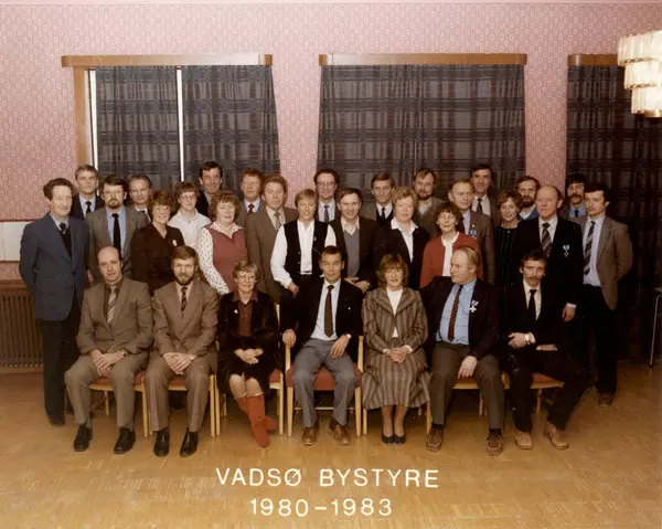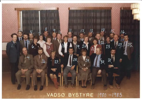Subject Vadsø bystyre 1980-1983. På bildet ser vi; nr 1 Fredrik Fredriksen, nr 2 Svein Holsbø, nr 3 Asbjørn Berg, nr 4 Torbjørn Nordgård, nr 5 Håkon Utheim, nr 6 Jorun Stock, nr 7 Rigmor Søfting, nr 8 Andreas Vaage, nr 9 Steinar Karlsen, nr 10 Torvald Mannsverk, nr 11 Geir Johnsen, nr 12 Ivar Pedersen, nr 13 Trygg Jakola, nr 14 Ingolf Schanke, nr 15 Bjørn Hildonen, nr 16 Jan Basma, nr 17 Bjørg Betsi, nr 18 Liv Pedersen, nr 19 Olav Johnsen, nr 20, Unni Pedersen, nr 21 Karen Pedersen, nr 22 Erling Arvola, nr 23 Ingrid Mietinen, nr 24 Roger Jensen, nr 25 Ingvar Laberg, nr 26 Otto Strand, nr 27 Elsa Jonassen, nr 28 Paul Basma, nr 29 Odny Aleksandersen, nr 30 Arild Rushfeldt, nr 31 Arne Pedersen ( se nummer markert på bilde 2).